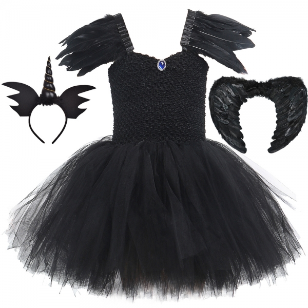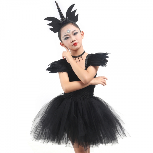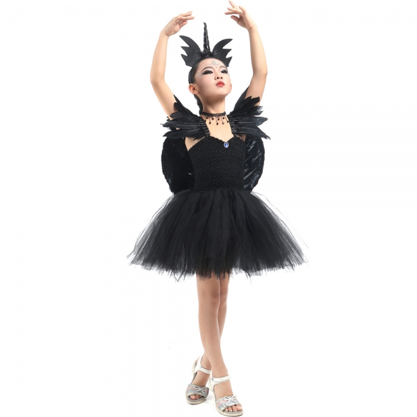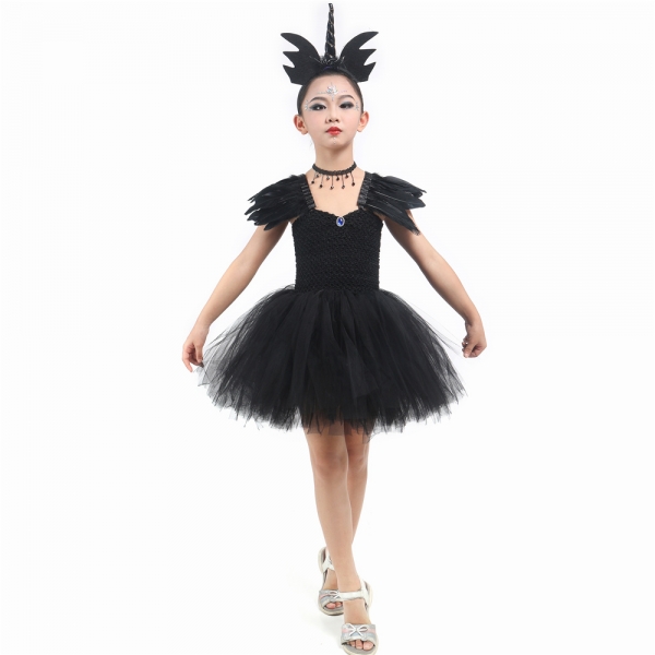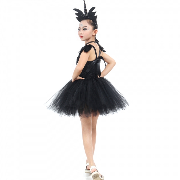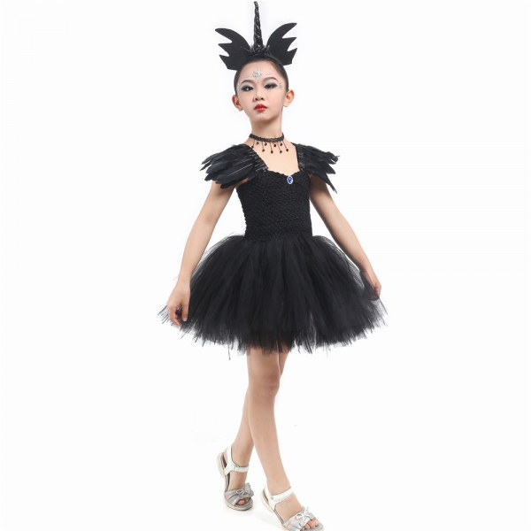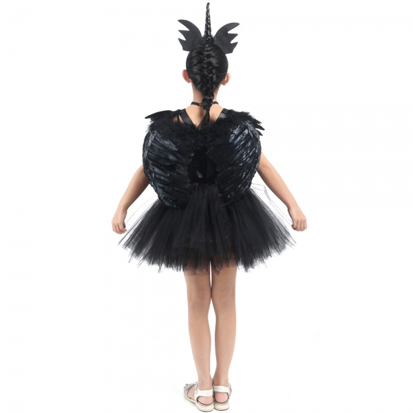 Costume licorne noir avec ailes en plumes pour fille