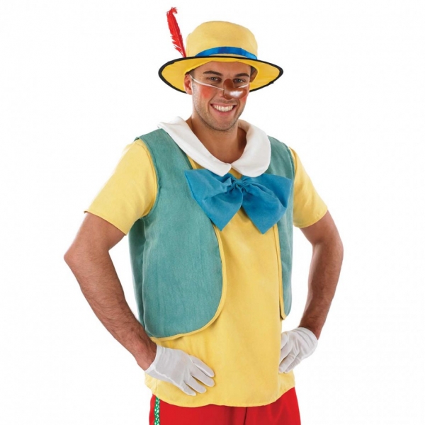 Le déguisement est completé par le nez de menteur de pinocchio, la paire de gants blancs ainsi que du chapeau jaune avec ruban bleu et plume rouge.