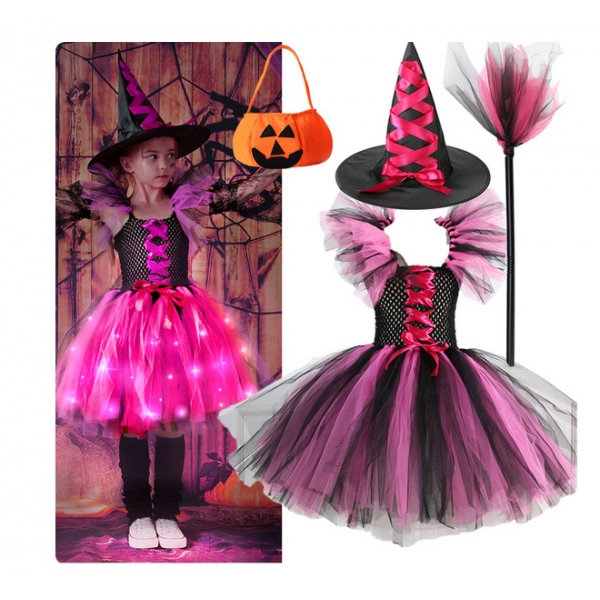 Costume Sorcière tutu rose avec lumineuse LED - déguisement halloween fille enfant