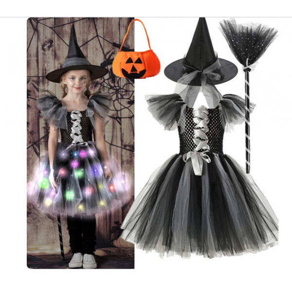 Costume Sorcière tutu gris lumineux LED - déguisement halloween fille enfant
